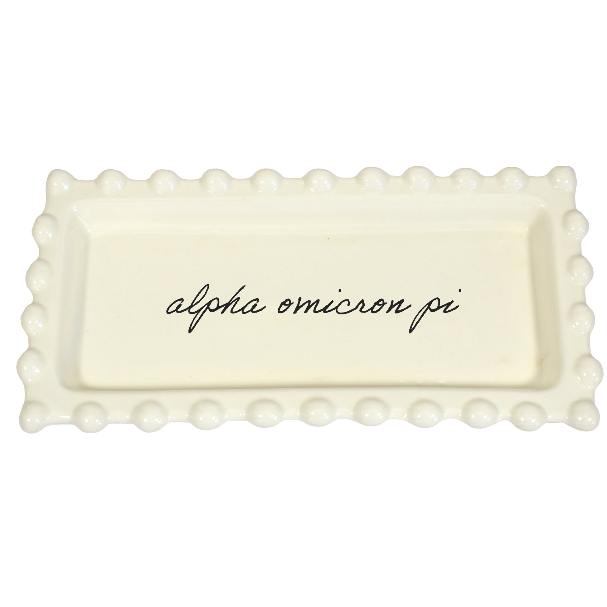Featuring a smooth gloss finish and an officially licensed Alpha Omicron Pi design, this rectangular dish is ideal for holding rings, earrings, necklaces, keys, or other small items. Its versatile size makes it a beautiful addition to a vanity, nightstand, desk, or dorm room.