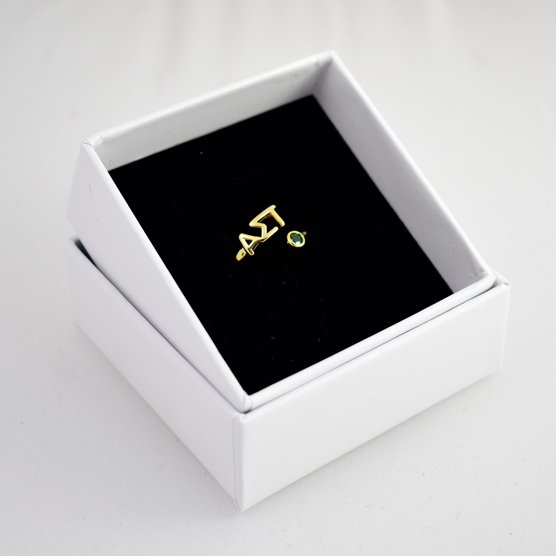 Add a meaningful touch of sisterhood to your everyday jewelry with the Alpha Sigma Tau Gemstone Ring. This elegant wraparound Greek letter ring features Alpha Sigma Tau letters plated in 18k gold and finished with a beautiful colored gemstone accent, creating a look that’s both timeless and eye-catching.