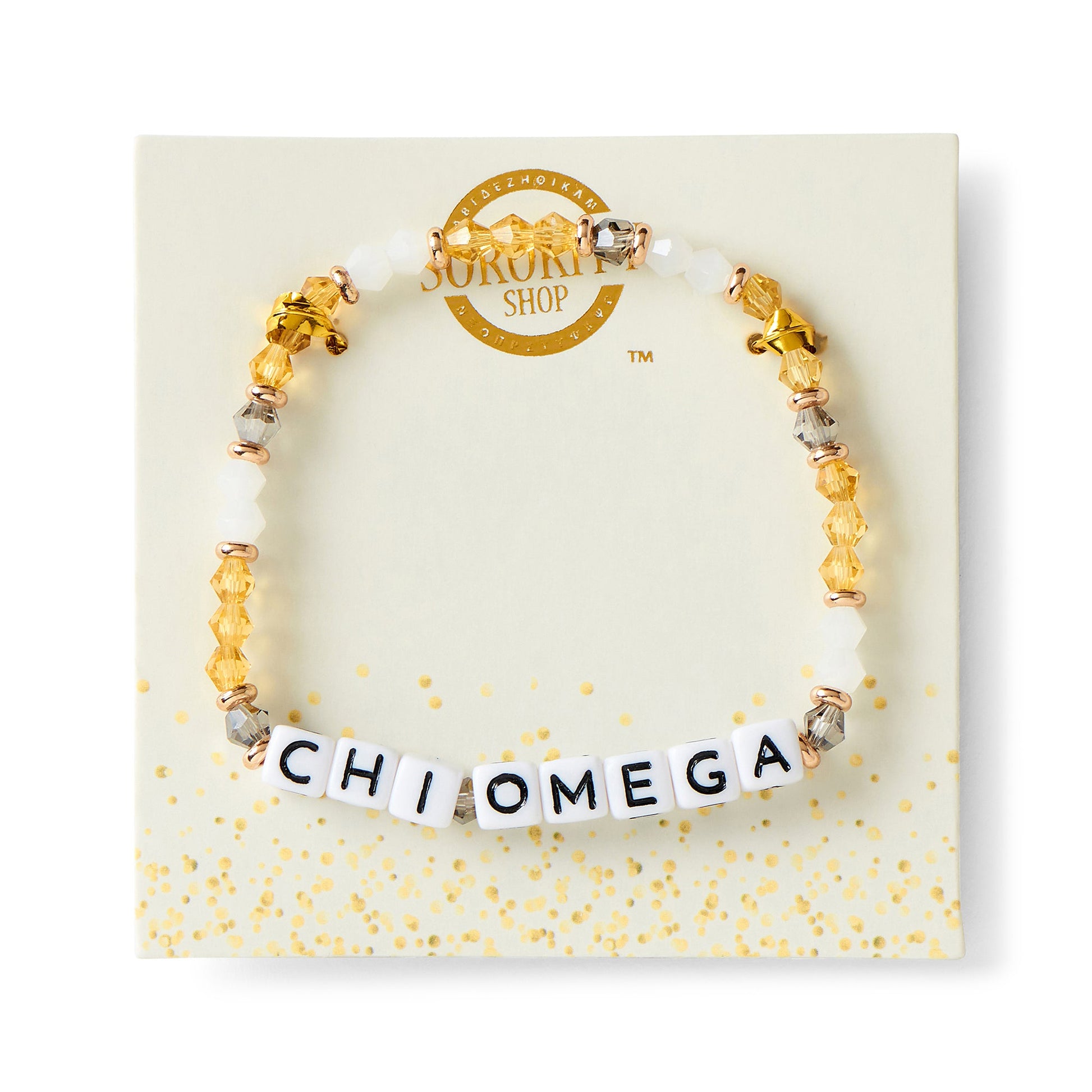 Elevate your sorority style with our Glass Beaded Sorority Name Bracelet featuring luxurious 18k gold accent beads. Designed with high-quality, sorority brand–colored glass beads, this officially licensed bracelet is the perfect way to show off your Greek pride with a touch of sophistication.