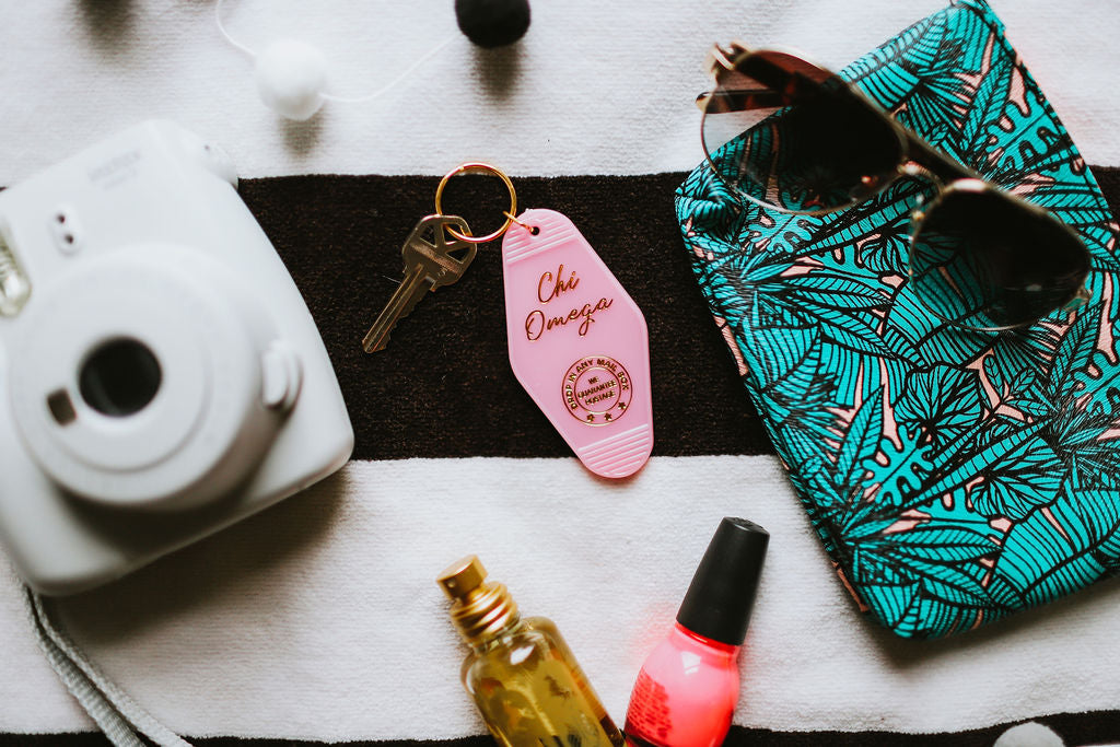 Show off your Chi Omega sorority letters with our NEW Vintage Motel Key Inspired Keychain! 😍