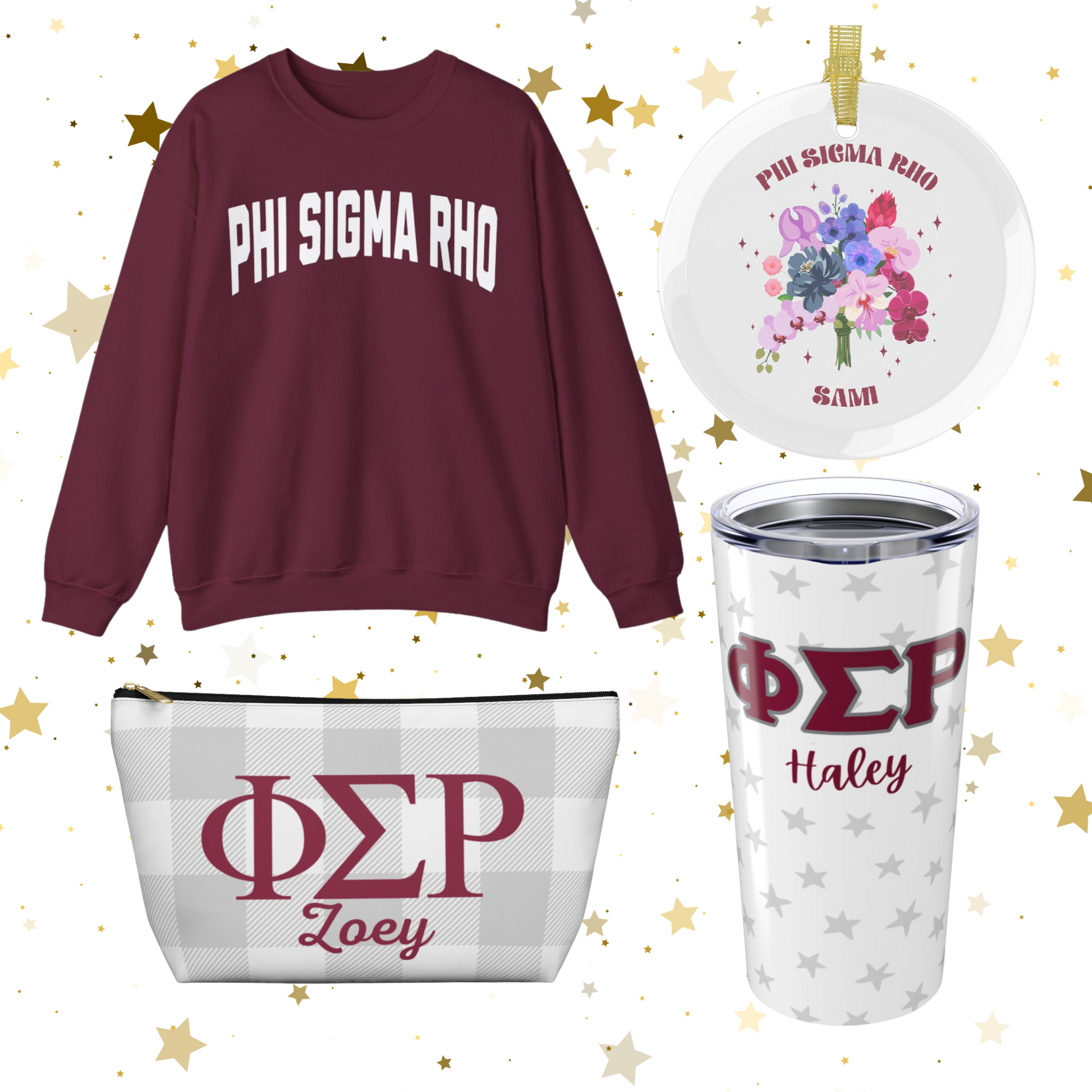 Phi Sigma Rho Sorority Gift Bundle – Sweatshirt, Glass Ornament, Tumbler & Makeup Bag