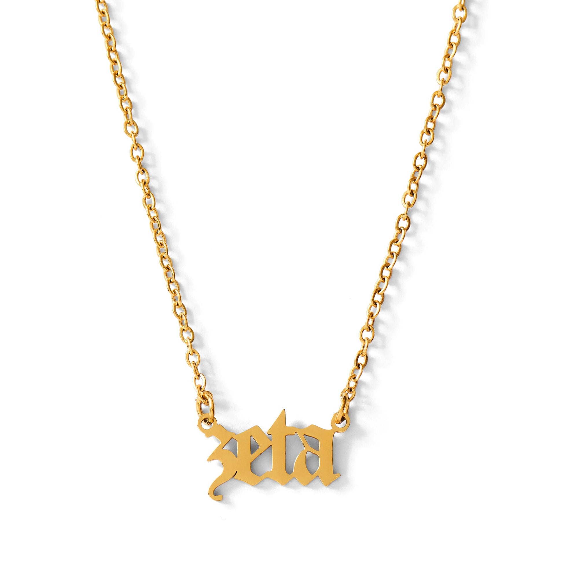 Celebrate your sisterhood in style with this Zeta Tau Alpha Old English necklace, featuring your sorority name in a bold, on-trend Old English font. The pendant and chain are crafted from stainless steel and finished with premium 18k gold vacuum plating for long-lasting shine.