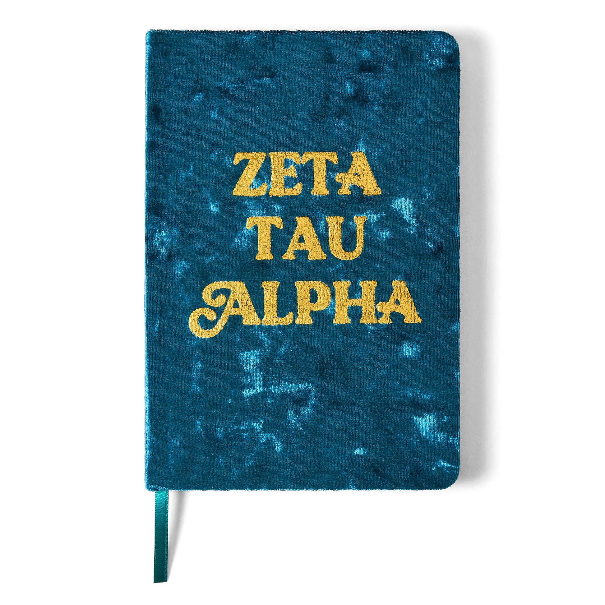 Add a touch of luxury to your desk with this Zeta Tau Alpha crushed velvet notebook in a rich teal finish, complete with a gold foil ZTA logo. Soft, stylish, and gift-ready, it’s perfect for journaling, class notes, meeting minutes, or keeping sorority plans organized.